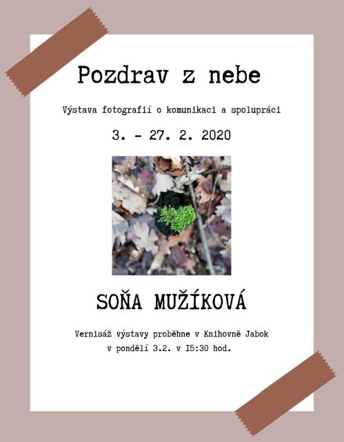 Zveme na výstavu fotografií studentky Jaboku Soni Mužíkové Pozdrav z nebe s podtitulem Výstava fotografií o komunikaci a spolupráci.