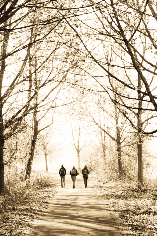 Fotografie v barvě sépiové kosti, na lesní cestě s holými stromy jsou vidět tři nezřetelné postavy s batony, před nimi je rozptýlené světlo