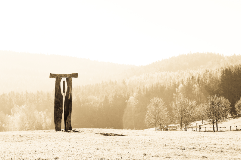 Na louce stojí zvonice tvořená dvěma sloupy an kterých je položený trám pro zavěšní zvonu, v pozadí sjou stromy a kopec
