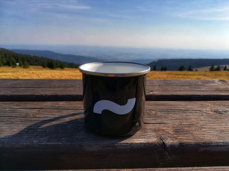 Černý hrnek s logem Jaboku venku na dřevěném stole někde na kopci, v pozadí jsou hory
