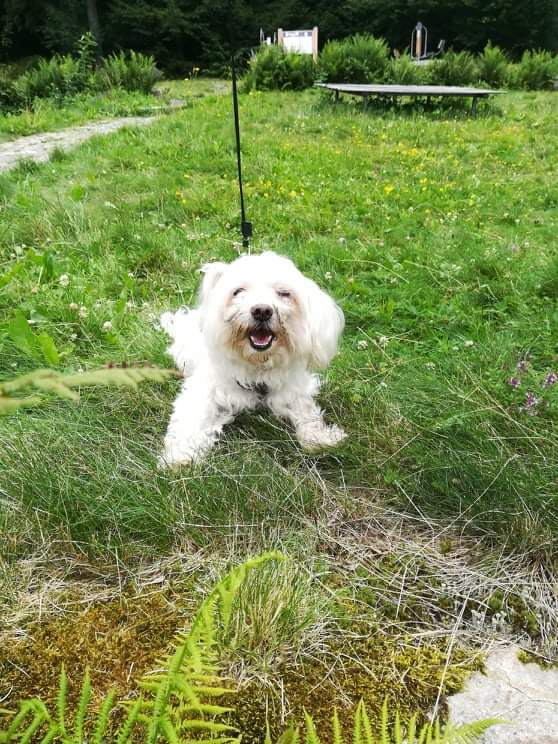 Bílý pejsek na trávníků, jeho výraz vypadá, jako by se smál