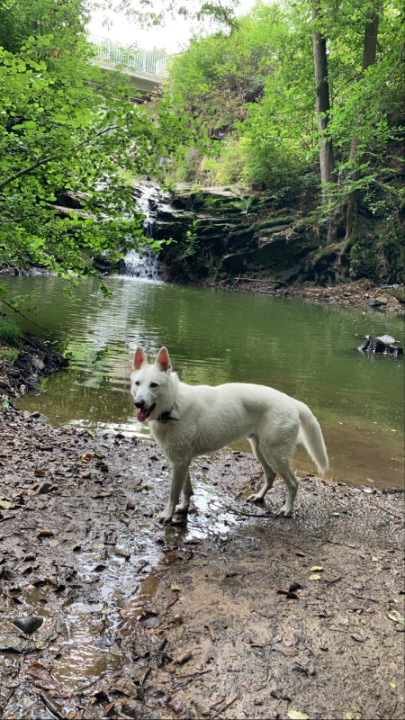 Pes na bahnitem břehu potoka, v pozadí malý vodopád