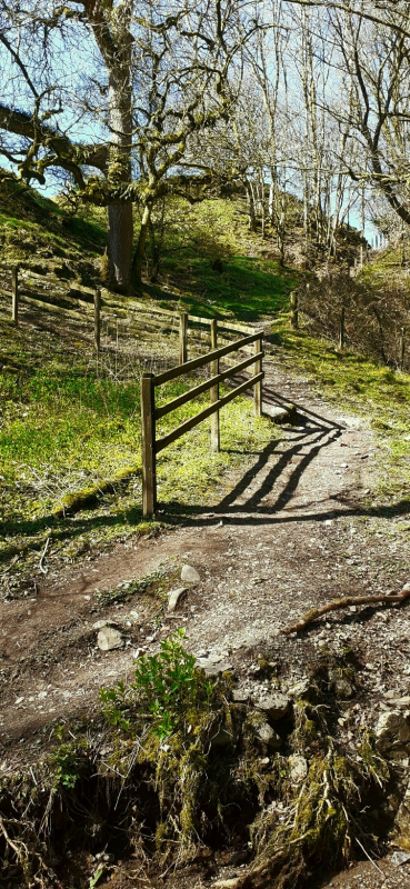 Klikatá pěšina vedoucí do kopce mezi předjarním porostem a stromy, na kraji pěšiny je dřevěné zábradlí vrhající stín