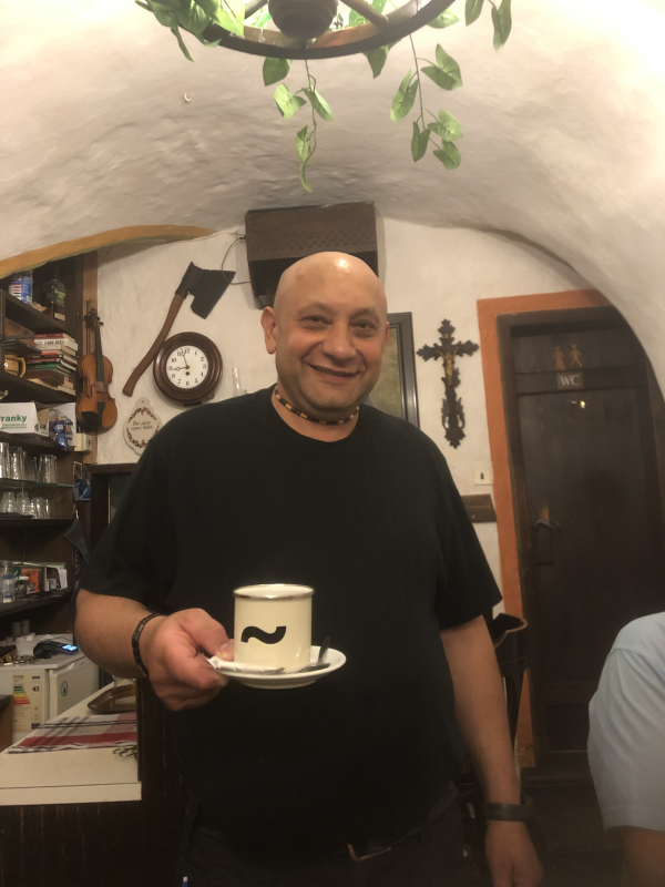 Interiér restaurace Cikánská jizba, muž drží v ruce plecháček s kávou, na plecháčku je logo Jaboku