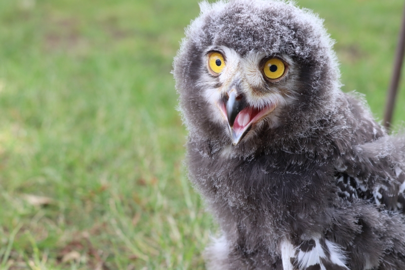 Mládě dravce s otevřeným zobákem, v pozadí zelená louka