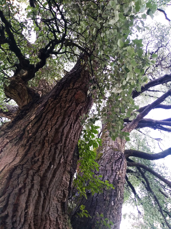Pohled nahoru do koruny vzrostlého topolu bílého, která je tvořená dvěma kmeny
