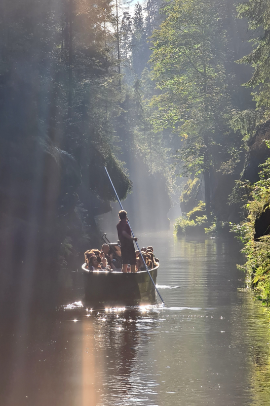 Člun na řece v soutěsce, ve člunu jsou vidět nezřetelné postavy a převozník s bidlem, nad řekou se vznáší opar, na hladině jsou záblesky slunce