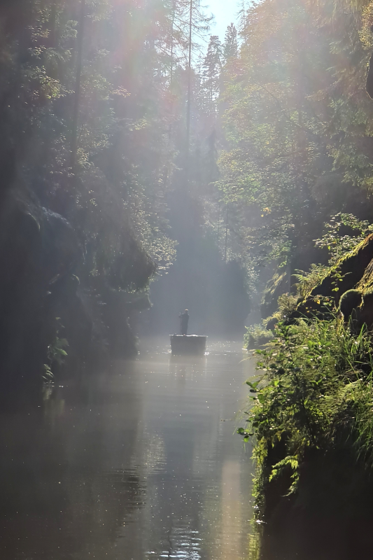Řeka v soutěsce, nad vodou se vznáší opar, v dálce je vidět člun s postavou převozníka, na hladině se odráží sluneční paprsky