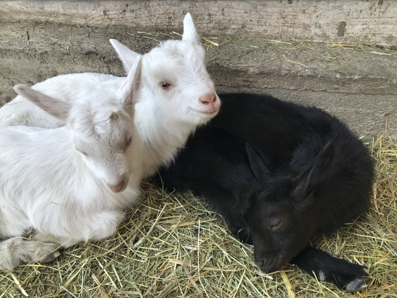 Dvě bílá a jedno černé kůzlátko, všechna kůzlat leží těsně vedle sebe na seně