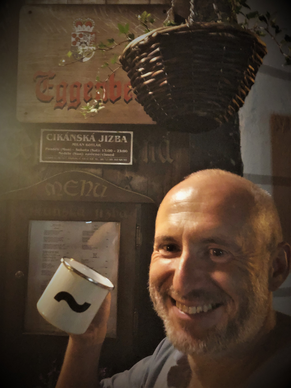 Muž v interiéru restaurace Cikánská jizba, drží v ruce hrnek s logem Jaboku, směje se, v očích se mu odráží světlo