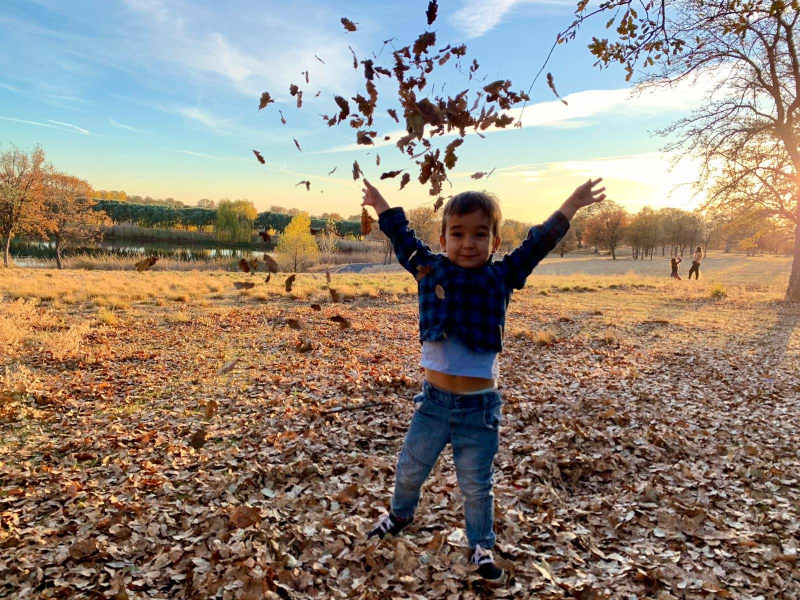 Malý chlapec v parku vyhazuje do vzduchu podzimní listí, které na něj shora padá, v pozadí je podzimní louka a žluté stomy