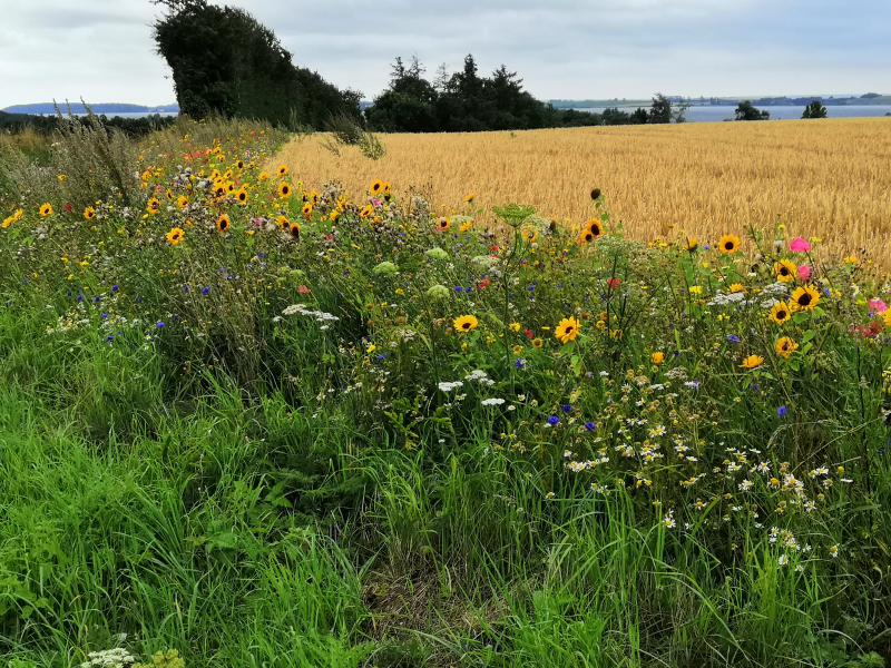 Stonky s červenými květy vlčích máků, za nimi je žlutá barva, pozadí je rozostřené a tušíme, že je to obilné pole
