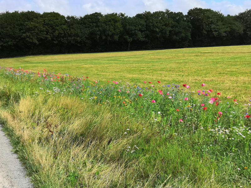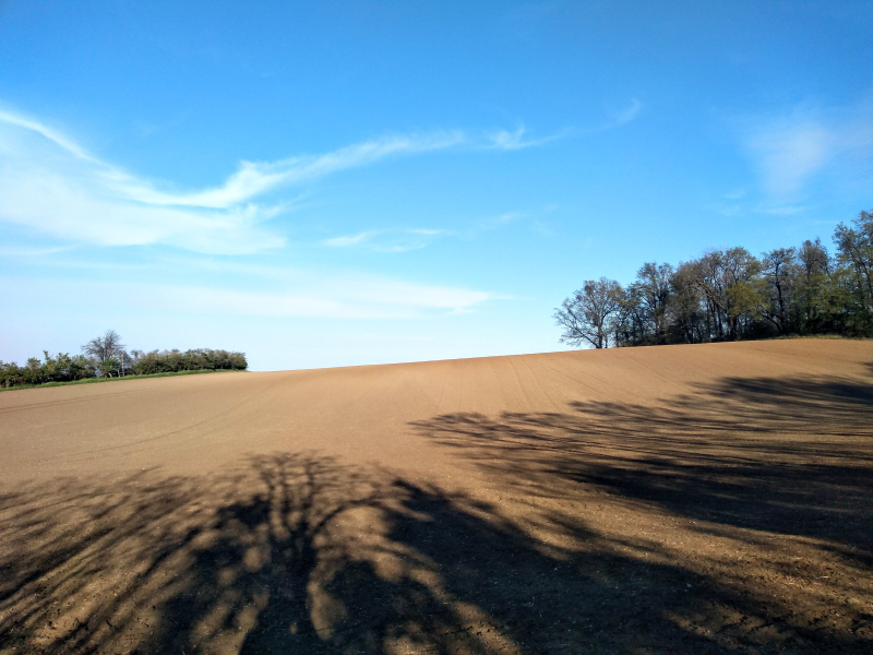 Pohled na holé pole se stíny stromů, které nejsou vidět. V pozadí jsou dvě skupiny stromů a modrá obloha s bílými mraky.