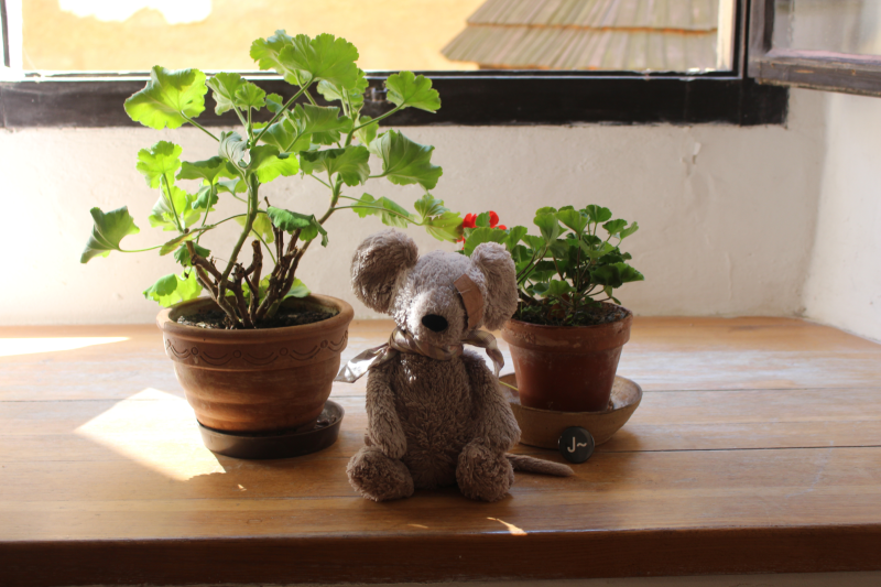 Na okenním parapetu jsou květináče s pelargóniemi, o ně je opřená plyšová myška se zalepeným okem