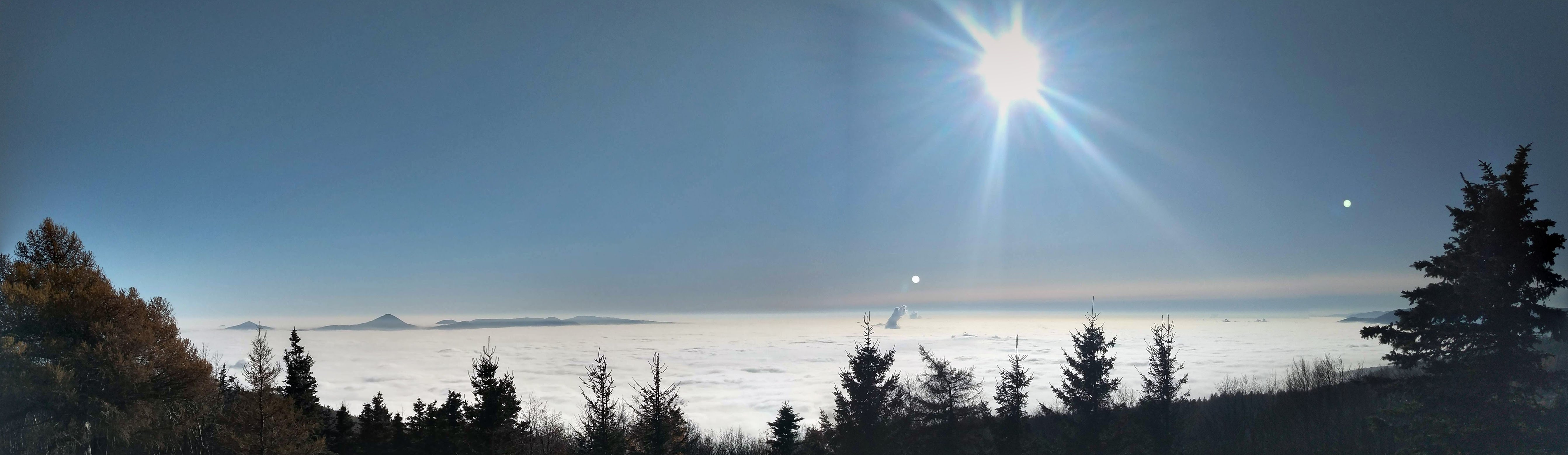 Pohled z kopce, v popředí jsou siluety stromů, pod nimi země zakrytá nízkými mraky, nad nimi svítí slunce, v dálce z mraků vykukuje několik kopců