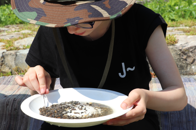 Holčička v klobouku a v jabockém třičku pinzetou hledá na talíři s kamínky zrníčka granátů