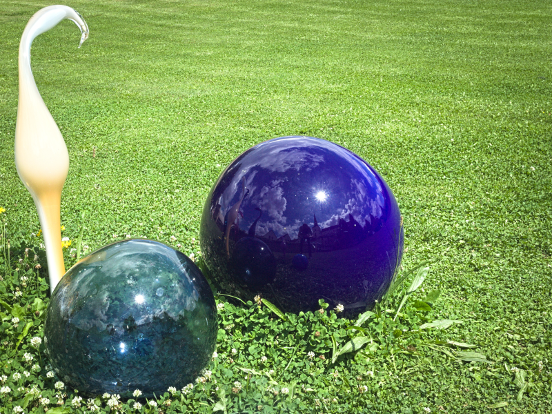 Na trávníku jsou dvě skleněné koule ve kterých se odráží slunce, na tmavomodré kouli se zrcadli silueta kostela a mraky