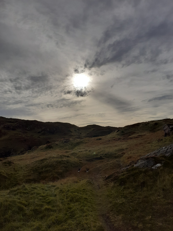 Horská krajina s vřesem a kameny, vpozdí kopce, na nebi se skrz tmavé mraky prodílrá slunce