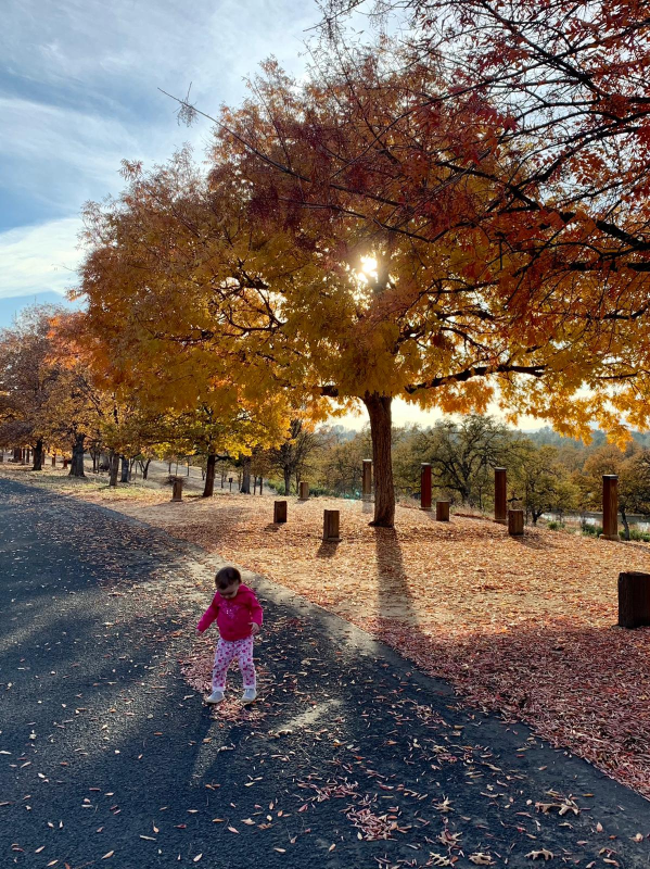 Malá holčička nohama posunuje listí na chodníku, za ní jsou podzimně zabarvené stromy skrze které probleskuje slunce