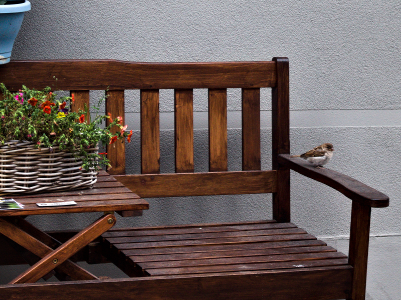 Drevěná lavička se stolkem a na něm košík s květinami, na opěrce lavičky sedí vrabec.