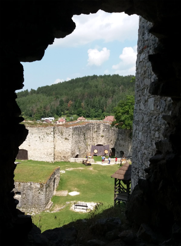 Průhled přes velký otvor v kamenné zdi, otvorem je vidět hrad