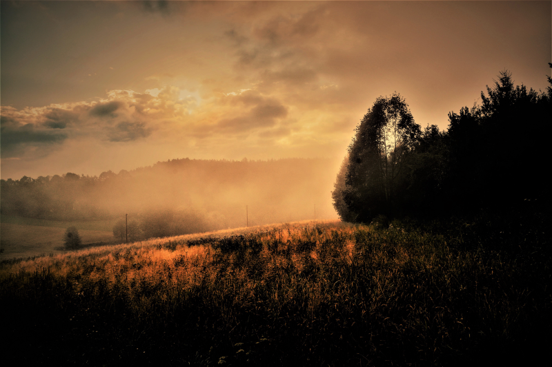 louka a les v ranním oparu, slunce není vidět ale osvětluje oblahu a krajinu oranžovým světlem, v pozadí jsou kopce a les