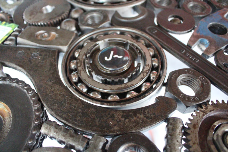 Soustava ozubených kol, uprostřed je kuličkové ložisko a na něm placka s logem Jaboku