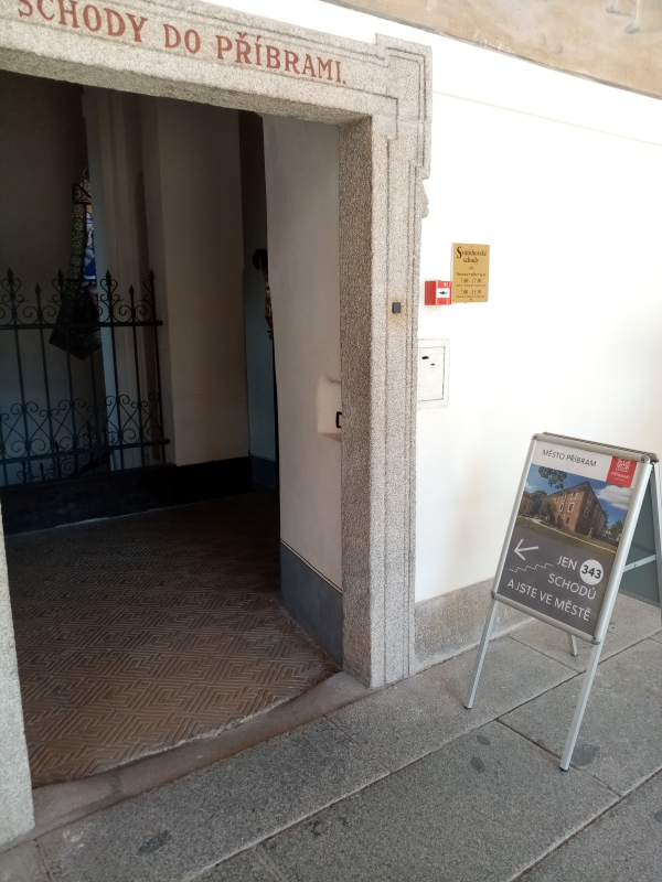 Pohled do průchodu, nad vstupem je nápis Schody do Příbrami, vedle vchodu reklamní poutač s nápisem jen 343 schodů a jste ve městě