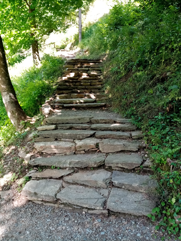 Schody poskládané z kamenů vedoucí do svahu, na jedné straně schodů je svah směrem nahoru, na druhé straně jsou stromy