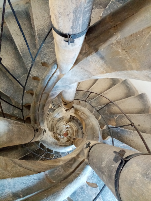 Pohled shora do hloubky na točité schodiště, vnitřní stranu schodiště podpírají tři sloupy, hloubka točitého schodiště vyvolává dojem víru