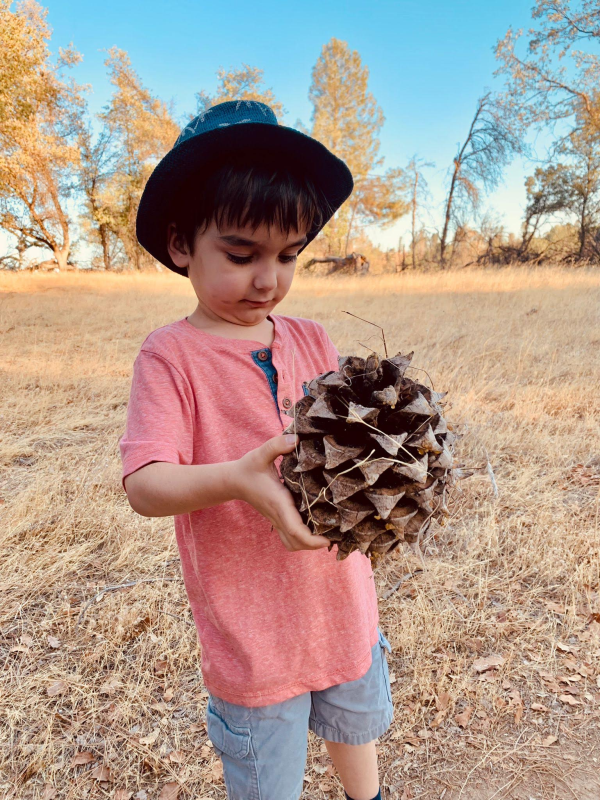 Malý chlapec v kraťasech, tričku a kloboučku stoljí na suchém porostu, a studuje šišku ze sekvoje větší než jeho hlava, kteoru drží v ruce. V pozadí jsou žluté stromy a modrá obloha