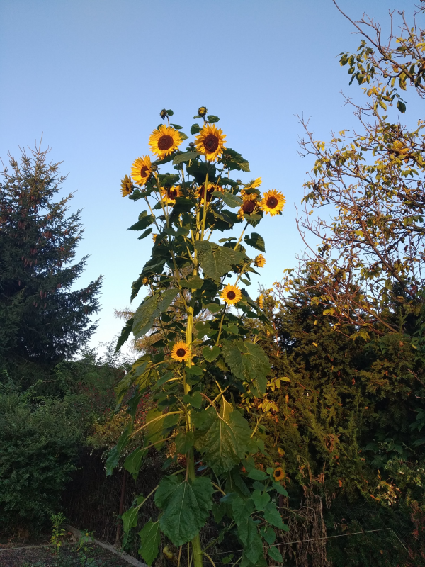 Vysoká rozvětvená slunečnice s mnoha květy, které jsou shora ozářeny ranním sluncem, v pozadí přírodní zahrada a stromy