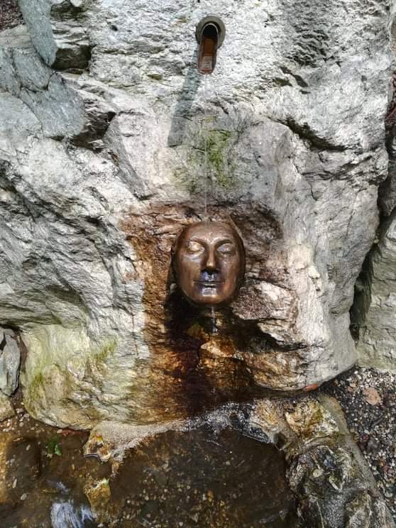 Pramen vytékající trubkou ze skály, voda dopadá na bronzový obličej umístěný pod pramenem