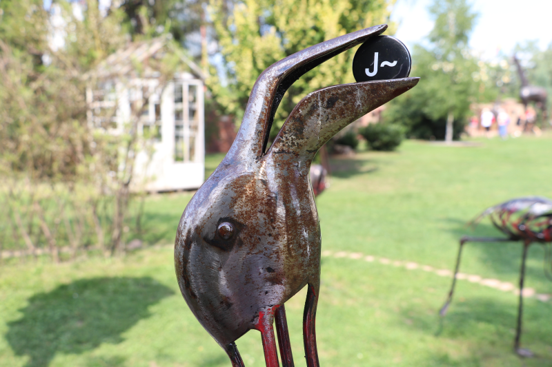 Kovové fantastické zvíře na zeleném trávníku drží v zobáku placku s logem Jaboku