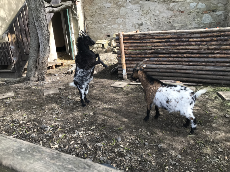 Dva kozlíci v ohradě u zděného stavení, jsou postavní proti sobě, jeden stojí na zadních nohách