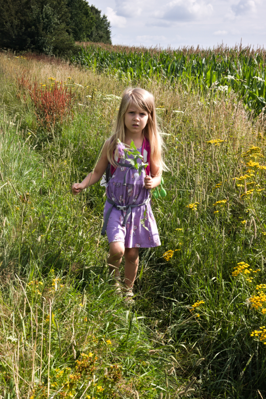 Světlovlasá holčička běží po cestičcena louce s polem v pozadí, šatičky má ozdobené natrhanými květinami