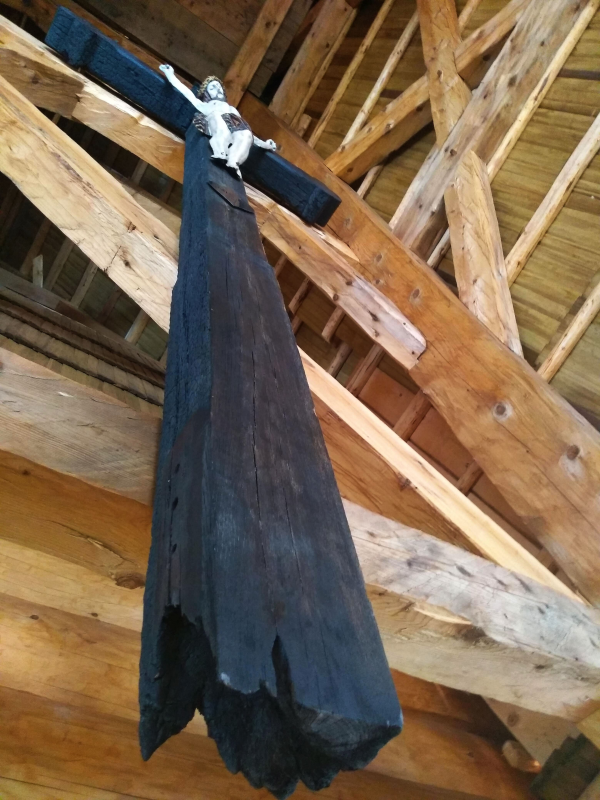 Pohled zespoda na ohořelý kříž  s tělem Krista, kříž je zavěšený mezi trámy dřevěného kostela