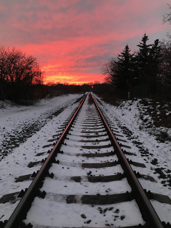 zasněžené koleje, po stranách les, v pozadí je obloha červená od zapadajícího slunce