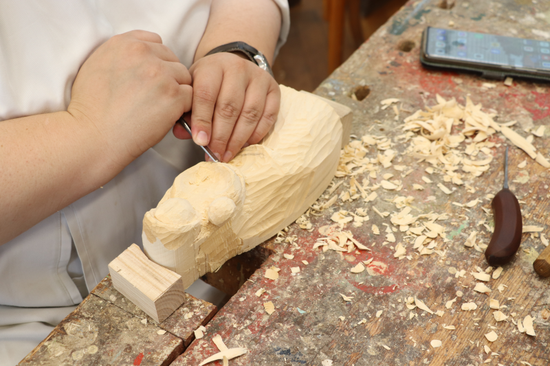 Ruce vyřezávající  postavu z kusu dřeva, je vidět, že postava řezbáře má bílý řeholní hábit.