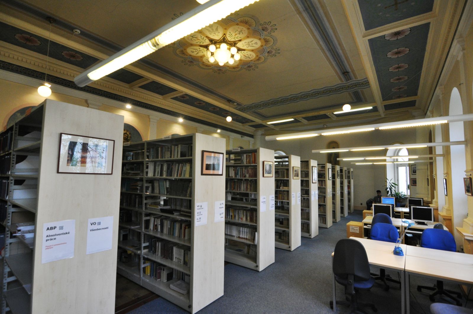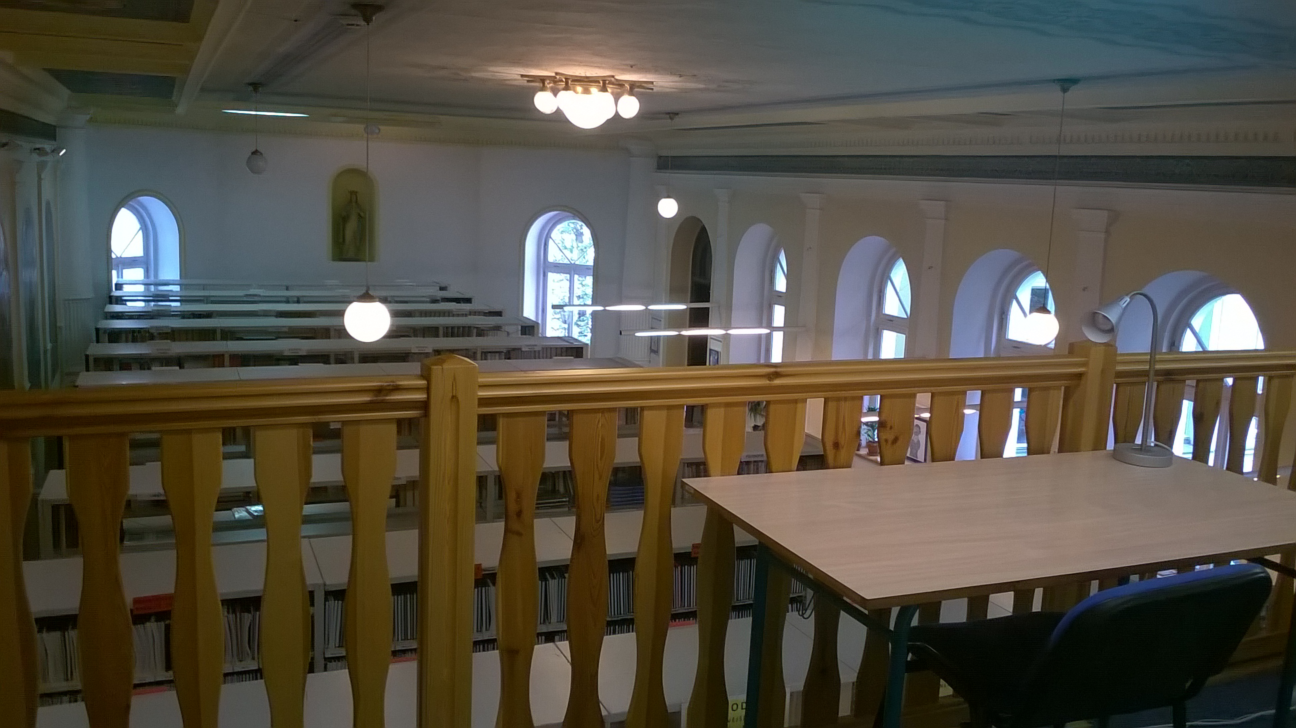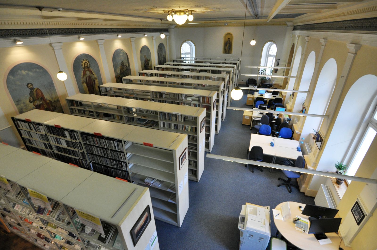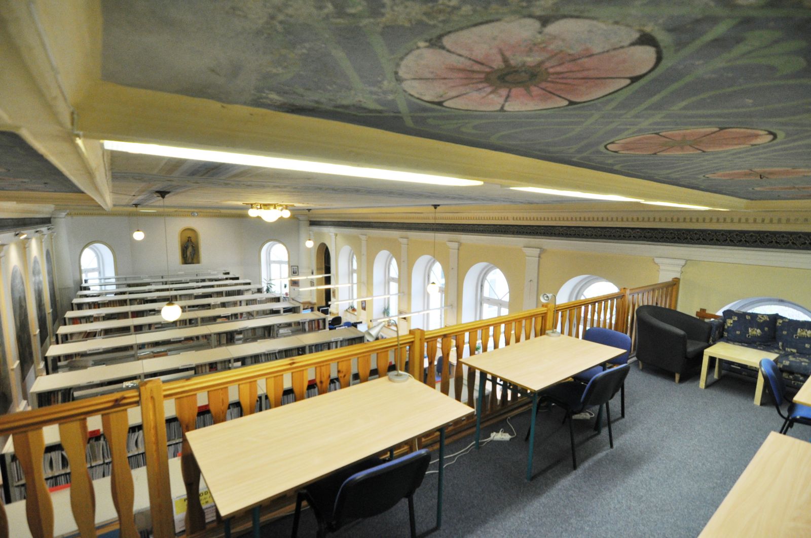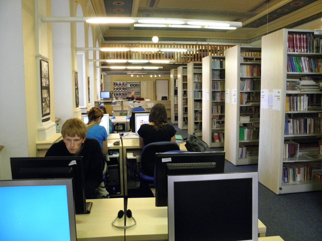 Pohled na knihovnu od výpůjčního pultu (tak to vidí knihovník) Mezi regály Lustr se secesní výzdobou Hlavní prostor knihovny (pohled ze zadní části) Tak trochu z jiného úhlu Ke knize patří pohoda ve formě kávy nebo čaje Točité schody do patra Pohled na knihovnu shora Studovna v patře a pohled na knihovnu shora Pohled na knihovnu ze studovny Pohled na knihovnu shora Studovna na bývalém kůru Pohled ze zadní části knihovny směrem k výpůjčnímu pultu Pohled ze studovny Počítačová místa Vyhledávání v katalogu Počítačová a studijní místa Hlavní prostor knihovny s katalogem pro čtenáře Počítačová a studijní místa Malý čtenář Vyhledávání knih v regále Mezi regály Výpůjční pult a regály s časopisy Počítačová a studijní místa Studijní příprava Studijní a počítačová místa Odpočinkový kout ve studovně Při výběru knih rozhodně pomůže hrnek kávy Výpůjční pult a regál s časopisy Když maminka studuje Previous Next O fotogalerii: Prostory knihovny (knihovna je umístěna v bývalé kapli se secesní výzdobou)