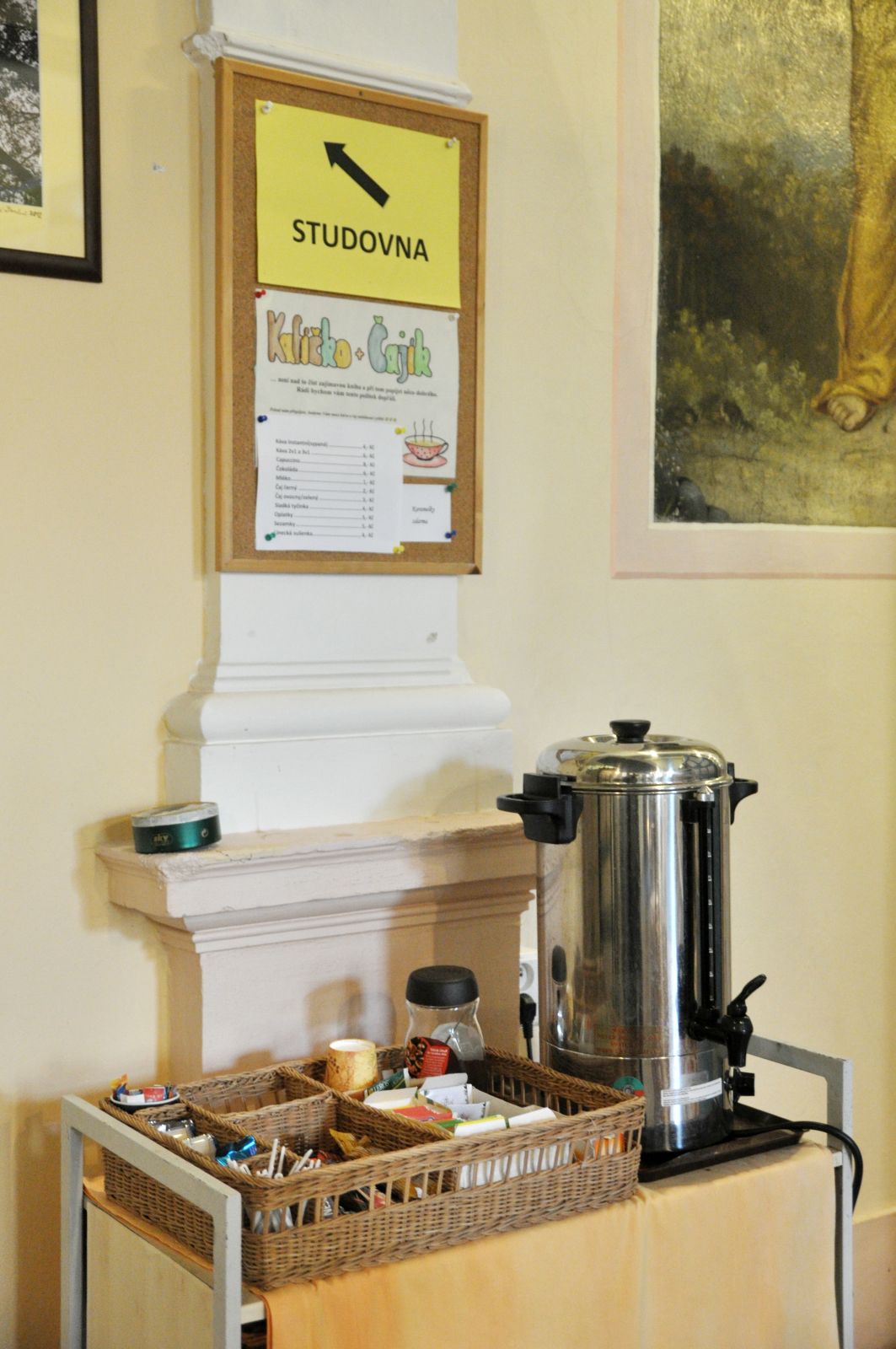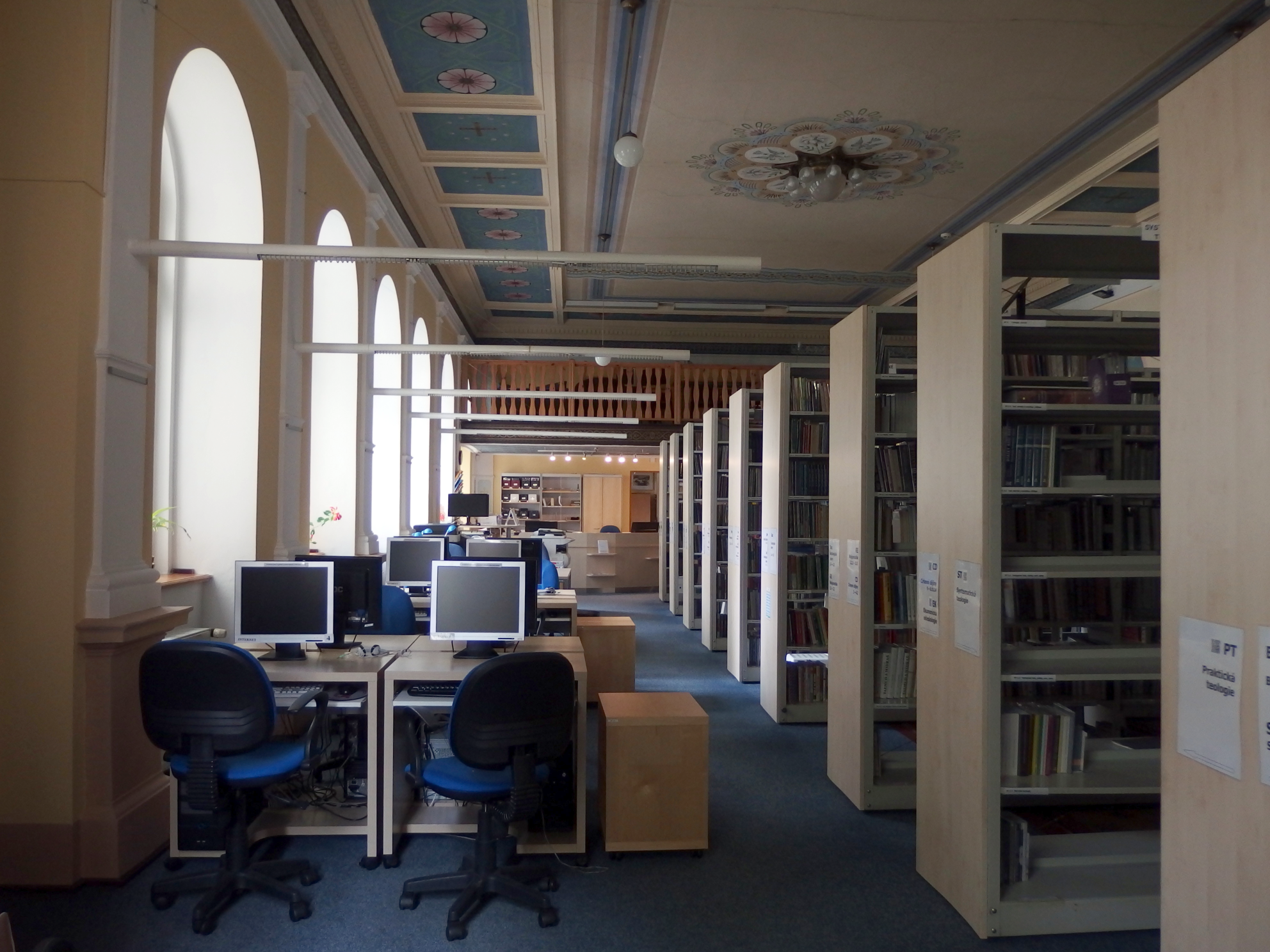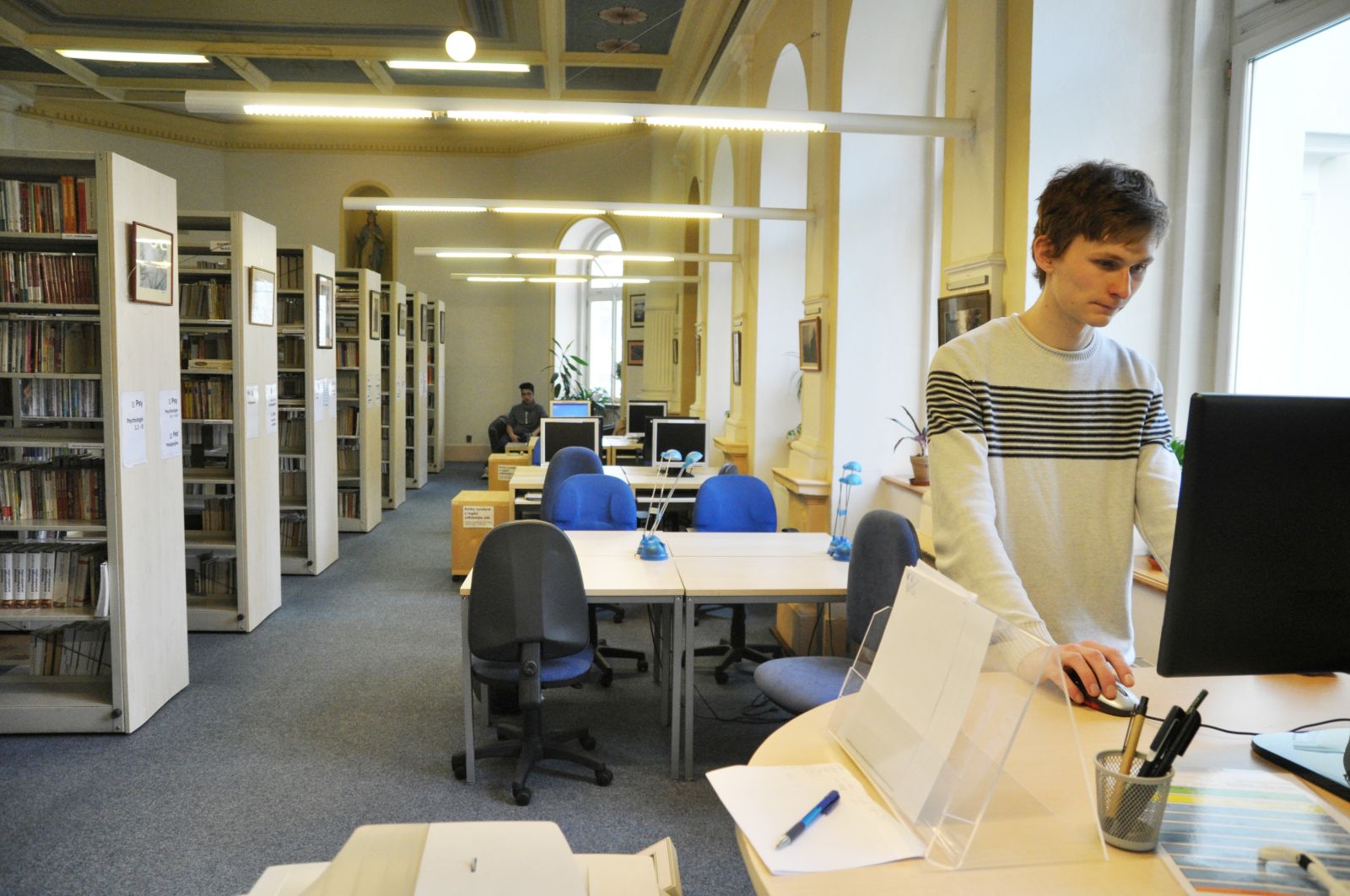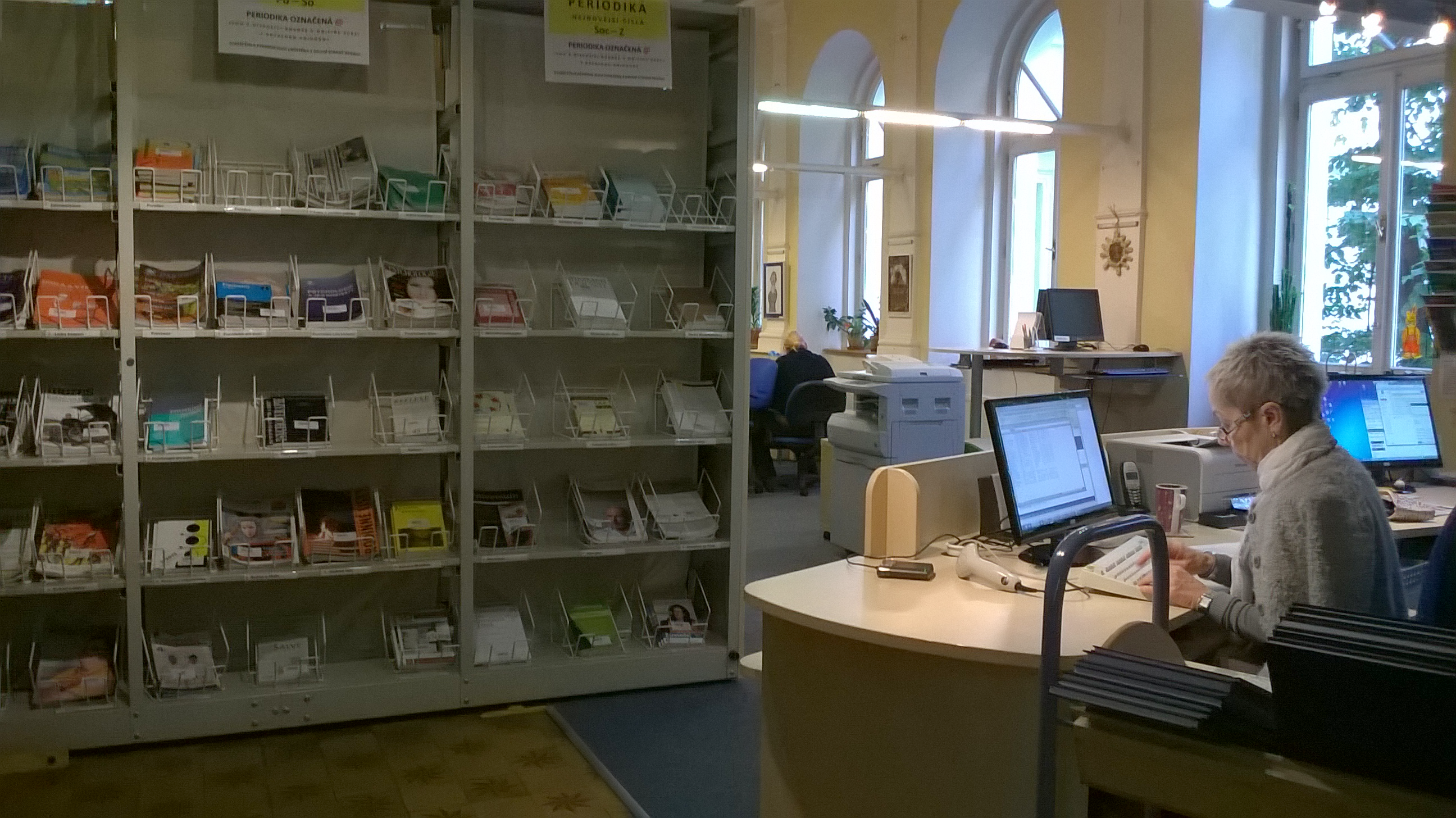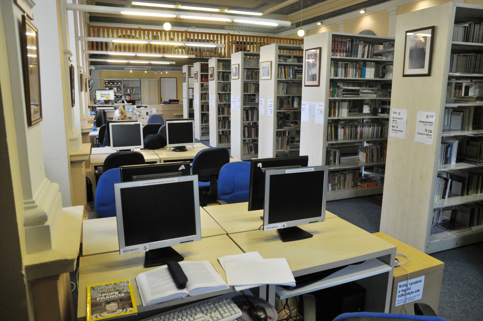Pohled na knihovnu od výpůjčního pultu (tak to vidí knihovník) Mezi regály Lustr se secesní výzdobou Hlavní prostor knihovny (pohled ze zadní části) Tak trochu z jiného úhlu Ke knize patří pohoda ve formě kávy nebo čaje Točité schody do patra Pohled na knihovnu shora Studovna v patře a pohled na knihovnu shora Pohled na knihovnu ze studovny Pohled na knihovnu shora Studovna na bývalém kůru Pohled ze zadní části knihovny směrem k výpůjčnímu pultu Pohled ze studovny Počítačová místa Vyhledávání v katalogu Počítačová a studijní místa Hlavní prostor knihovny s katalogem pro čtenáře Počítačová a studijní místa Malý čtenář Vyhledávání knih v regále Mezi regály Výpůjční pult a regály s časopisy Počítačová a studijní místa Studijní příprava Studijní a počítačová místa Odpočinkový kout ve studovně Při výběru knih rozhodně pomůže hrnek kávy Výpůjční pult a regál s časopisy Když maminka studuje Previous Next O fotogalerii: Prostory knihovny (knihovna je umístěna v bývalé kapli se secesní výzdobou)